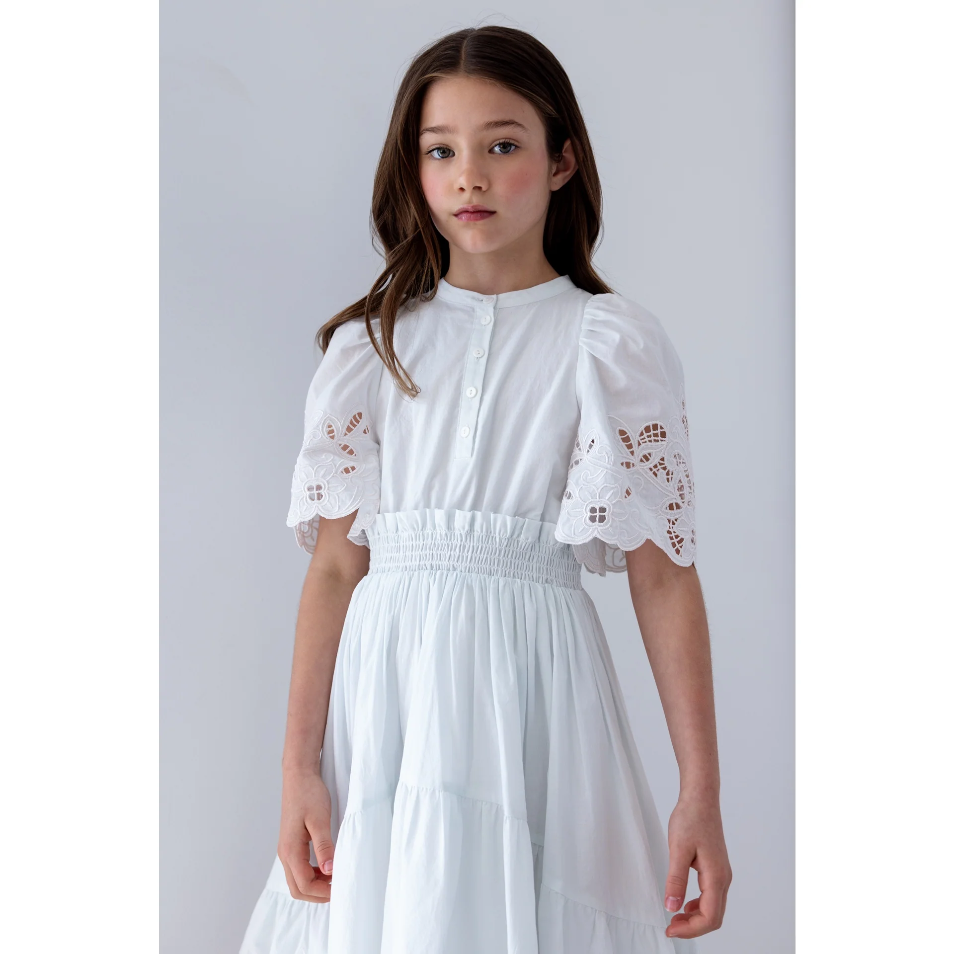 Petite Amalie Light Blue/Ivory Shirred Embroidered Dress